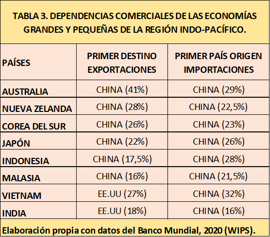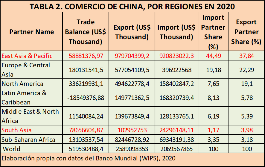 La región Indo-Pacífico representa el destino y el origen de la mayor parte del comercio chino. Casi un 42% de sus exportaciones se dirigen a esta región y casi el 46% de las importaciones proceden de ella, sin incluir a la economía americana.