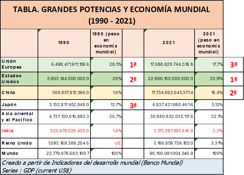 La tabla también nos aporta una idea aproximada del incremento del poder relativo de China, que ha sustituido a Japón como primera economía de la región (desde 2010) y a la Unión Europea como segunda economía mundial (2021). El PIB anual chino ha crecido una media del 9% elevando su peso en la economía mundial del 1,6% en 1990 a 18,4% en 2021, solo por detrás de EE.UU. Por su parte, la cuota de la UE se ha contraído casi ocho puntos, si eliminamos el efecto distorsionador del BREXIT y ha pasado de primera economía mundial a tercera economía, mientras que la cuota de Japón se ha desplomado de un 13,7% a un 5,13%.