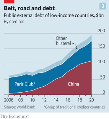 [x] La pandemia COVID 19 y la guerra de Ucrania han agravado la situación de esos países pobres que ahora se enfrentan al pago de deudas millonarias. China, que no participa en el Club de París, prefiere renegociar los préstamos de forma separada sin coordinarse con otros acreedores. Además, Pekín favorece reestructuraciones de deuda en las que no renuncia al principal, y en las que exige como pago otras variantes poco convencionales como el suministro de materias primas, participaciones en las infraestructuras que sus préstamos financian, o licitaciones para empresas chinas. Occidente la acusa de desarrollar una diplomacia que incita a los países pobres a caer en la trampa de la deuda y se plantea la política tradicional de quitas y alivio de la deuda del Club de París si China va por libre y exige un trato preferencial a sus préstamos.